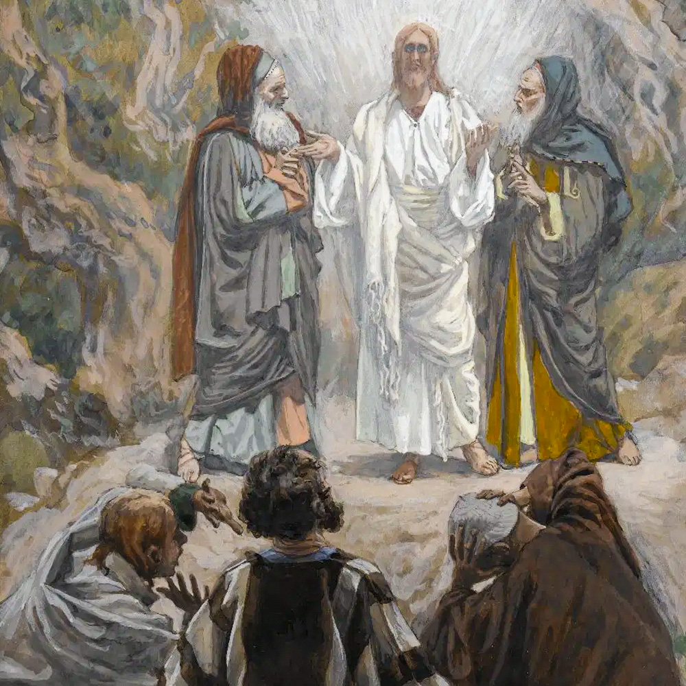 U ono vrijeme: Povede Isus sa sobom Petra, Ivana i Jakova te uziđe na goru da se pomoli. I dok se molio, izgled mu se lica izmijeni, a odjeća sjajem zablista. I gle, dva čovjeka razgovarahu s njime. Bijahu to Mojsije i Ilija. Ukazali se u slavi i razgovarali s njime o njegovu Izlasku, što se doskora imao ispuniti u Jeruzalemu. No Petra i njegove drugove bijaše svladao san. Kad se probudiše, ugledaše njegovu slavu i dva čovjeka koji stajahu uza nj. I dok su oni odlazili od njega, reče Petar Isusu: »Učitelju, dobro nam je ovdje biti. Načinimo tri sjenice: jednu tebi, jednu Mojsiju, jednu Iliji.« Nije znao što govori.